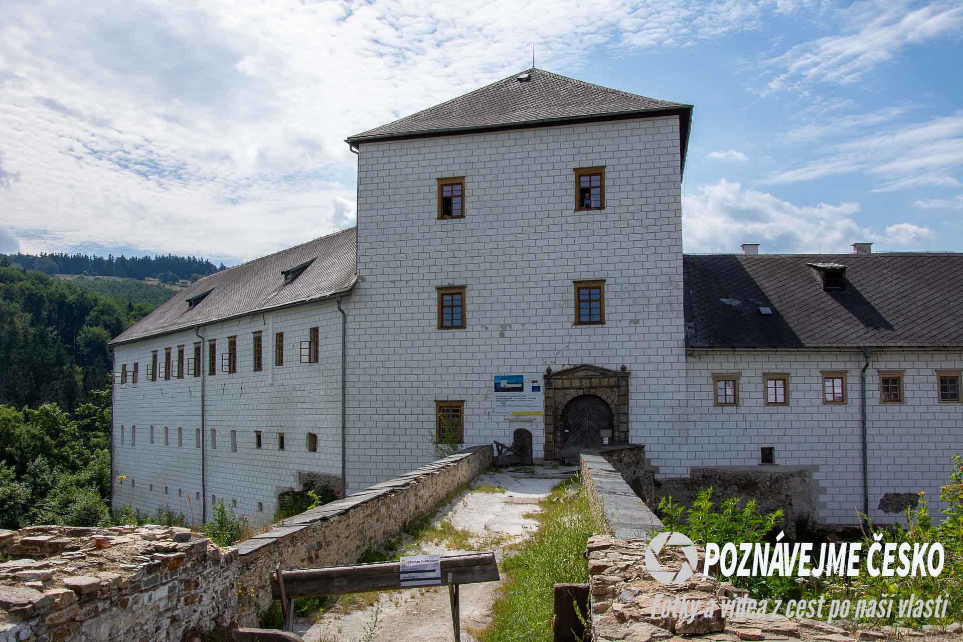 V zadní části areálu, která je při pohledu z obce skryta za zámkem, se z věže otevírá pohled na vlastní hradní jádro. To zaujímá plochu přibližně 34 x 50 metrů a je vymezeno hradbou, která využívá v našich zemích málo obvyklý prvek štítové zdi. Z vyhlídky jsou v těchto místech dobře viditelné zbytky původního gotického hradu bergfritového typu, zejména torzo válcové věže, zbytky hradeb a fragmenty paláce, které tvoří nejstarší vrstvu celého komplexu z počátku 14. století.