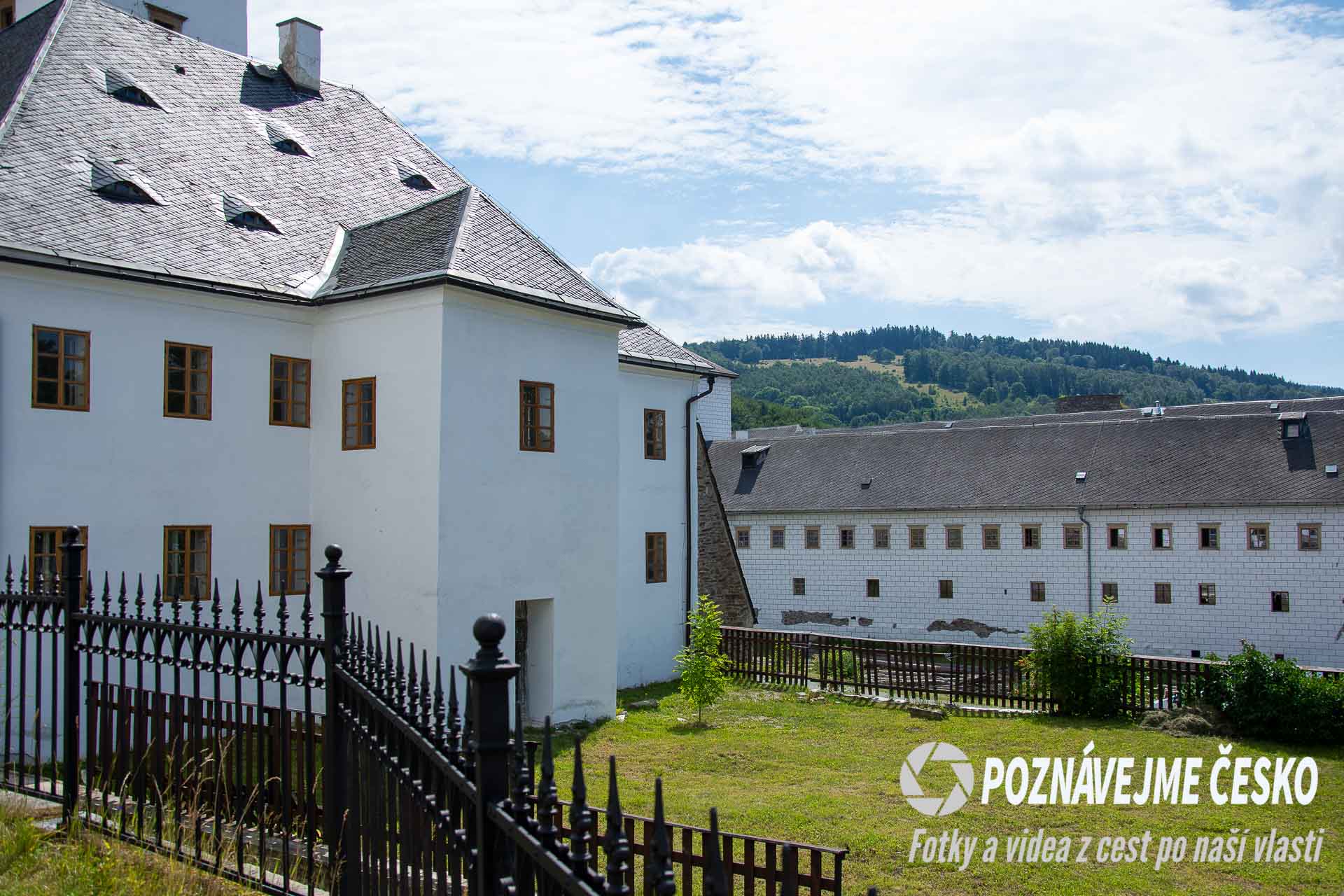 Pohled z věže odhaluje členitou architekturu areálu, kterému dominuje trojkřídlý renesanční arkádový zámek zdobený částečně dochovanou sgrafitovou omítkou a vnějšími i vnitřními pískovcovými portály. Návštěvník může z výšky sledovat rozdělení sídla na několik částí, včetně tzv. středního zámku, což je trojkřídlá patrová renesanční budova přiléhající k hradním ruinám, a severně položeného dolního zámku, jehož budovy s vlastní hranolovou věží obklopují obdélníkové nádvoří.