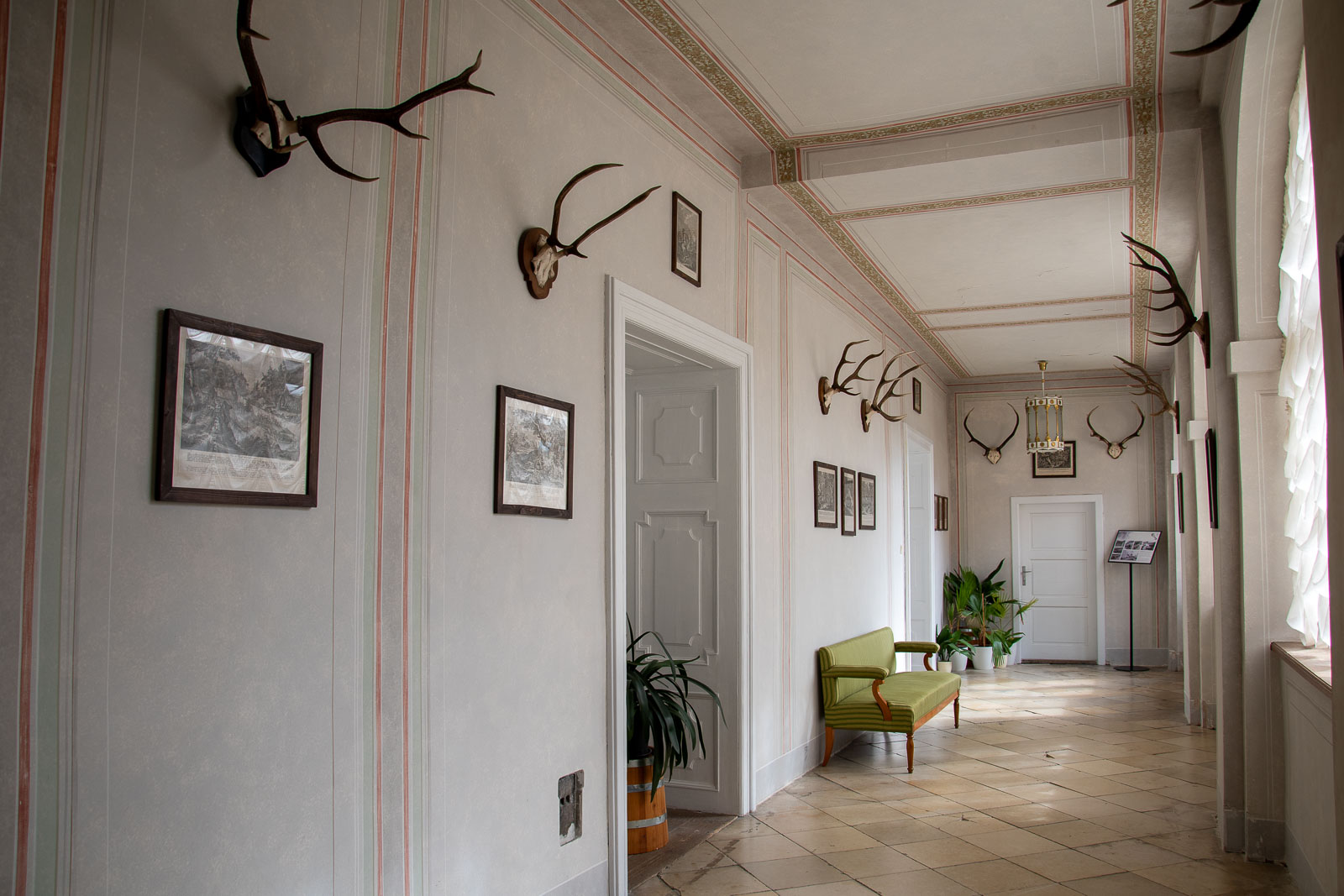 První patra Veveří často otevírá arkádová chodba, která vznikla až při přestavbách v 17. století. A hned tady vás do nosu praští jedno velké téma: lov. Trofeje na stěnách nepůsobí jako náhodná dekorace – připomínají, že hrad sloužil po dlouhá staletí hlavně jako letní lovecké sídlo. Dva obrazy s výjevy honu, grafické listy s německými popisky i samotná atmosféra „zámečku v lesích“ vás naladí na prohlídku, která není jen o zdech, ale o životním stylu tehdejších elit.