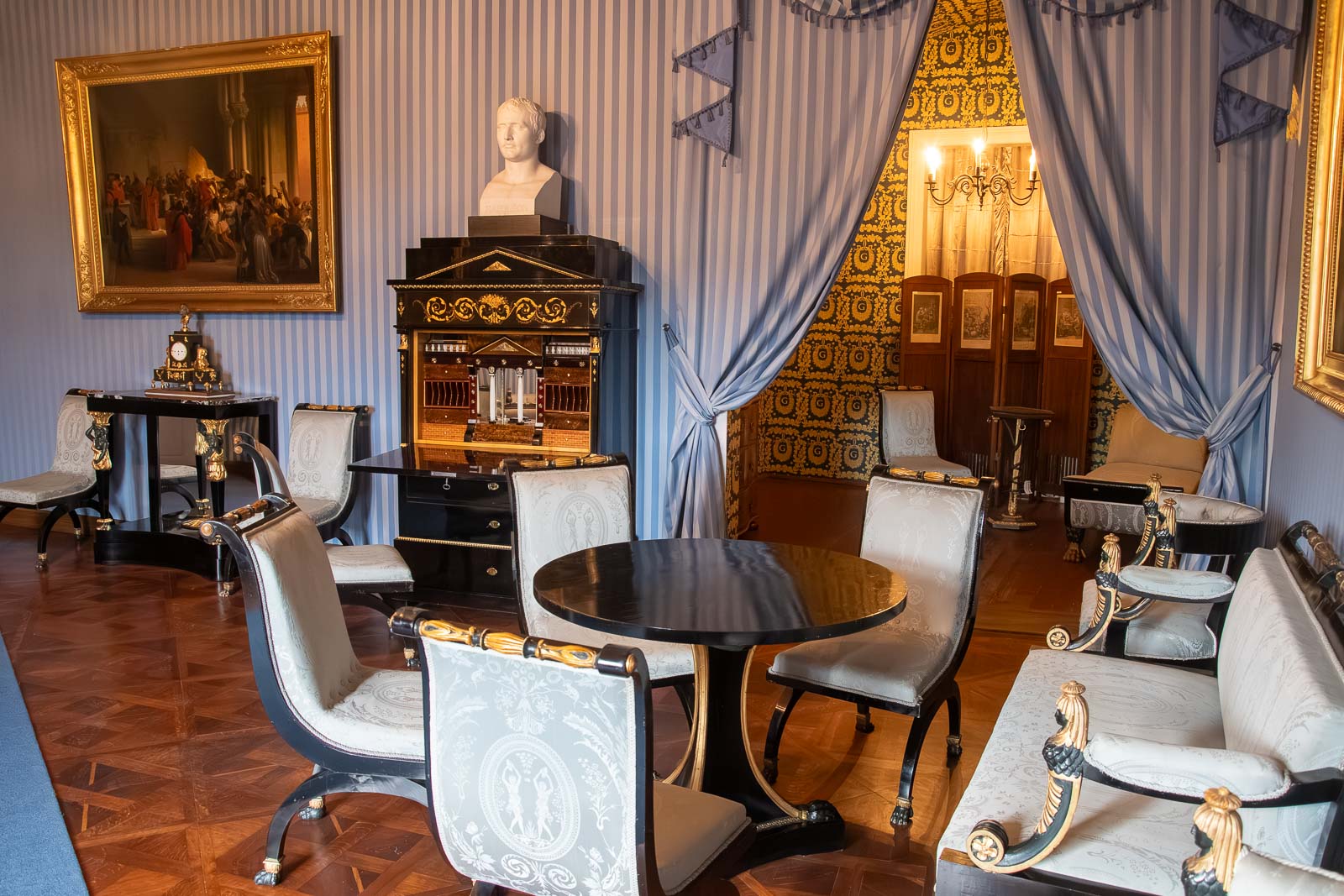 Jedna z prvních místností působí jako vizitka hradního pána: přijímací salon pro audience. Nábytek v císařském empíru je okázalý, „napoleonsky“ přísný i dekorativní zároveň – a poznáte ho i bez znalostí dějin umění. Stačí se zadívat na zvířecí nožky, symetrii, oblibu „exotických“ motivů a drobné detaily, které dělají z obyčejného kusu nábytku prohlášení.