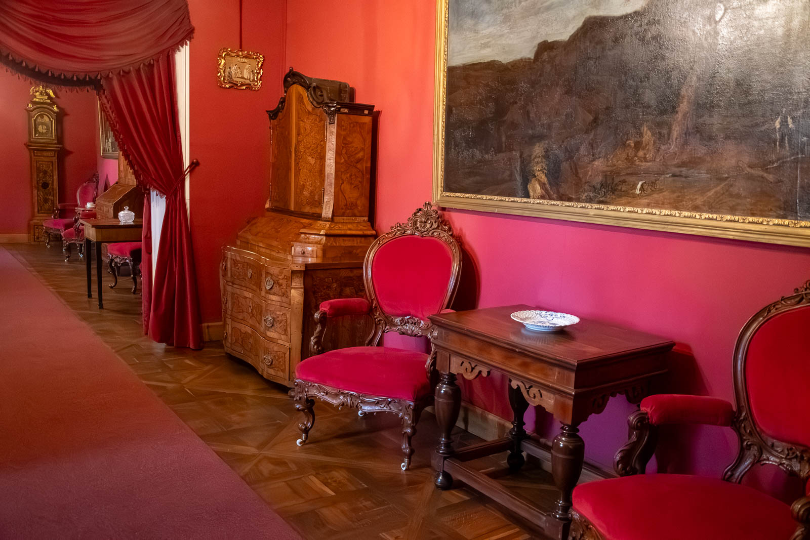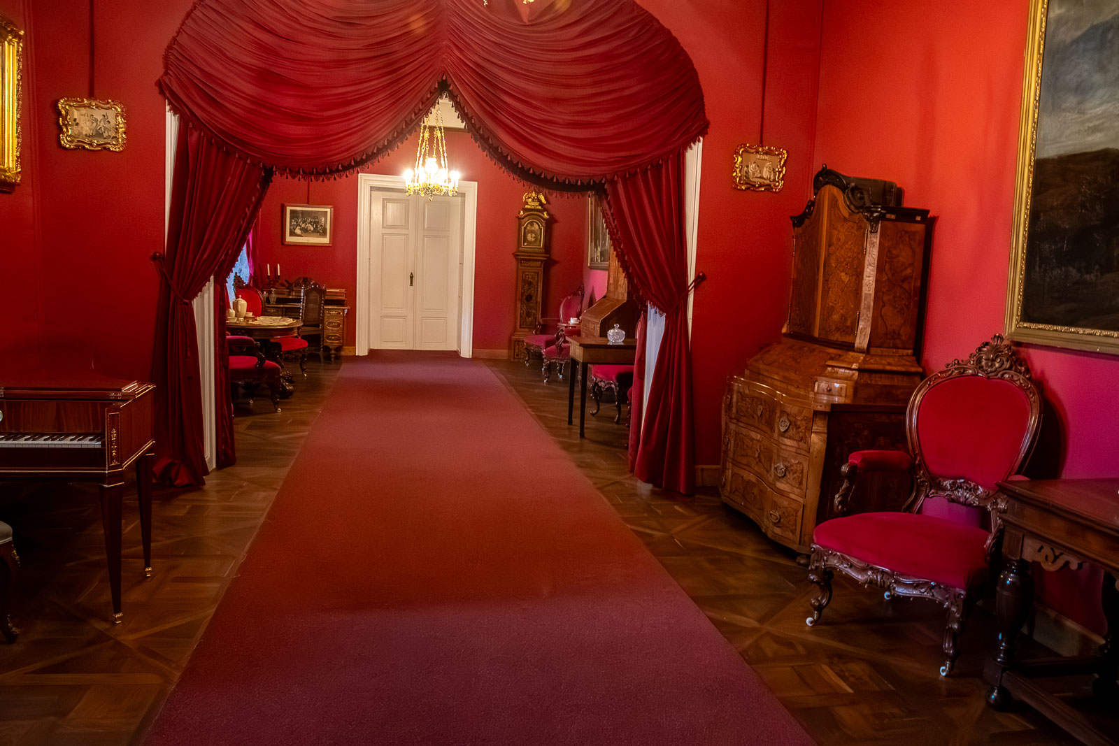 Červený salon (salon princezny Luisy) je prostor, kde se dá představit šlechtická společnost v chodu. Dříve se tu zatahovaly závěsy a místnost se mohla rozdělit na dvě části – dámy trávily volný čas hudbou, ručními pracemi, kresbou, četbou. A právě odsud se vypráví i jedna z nejživějších epizod: slavnosti pořádané na Luisiny jmeniny. Pod hradem prý bývalo občerstvení zdarma, hudba, veselí – a místní si získala i dcera Karola, když nosila lidový kroj.