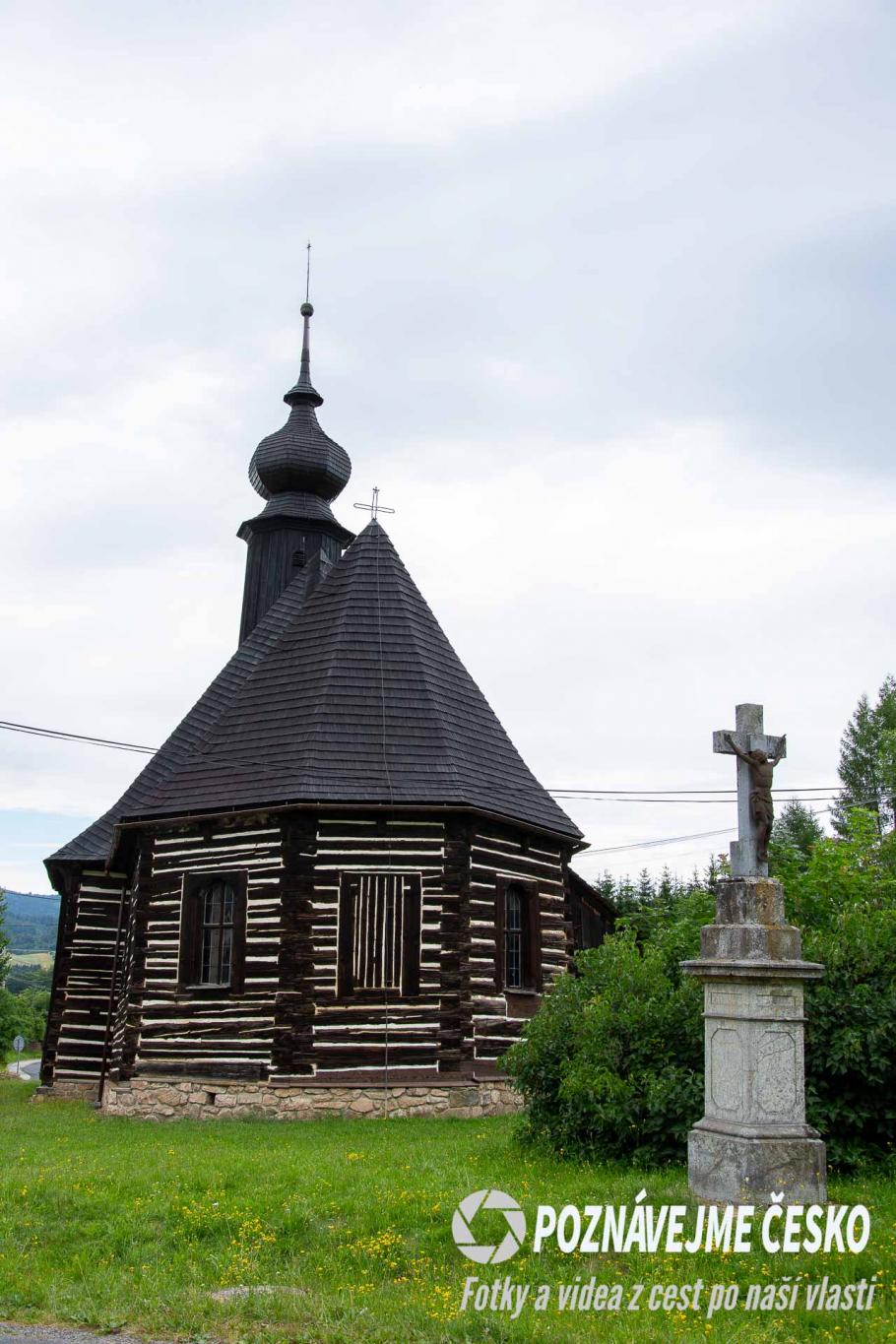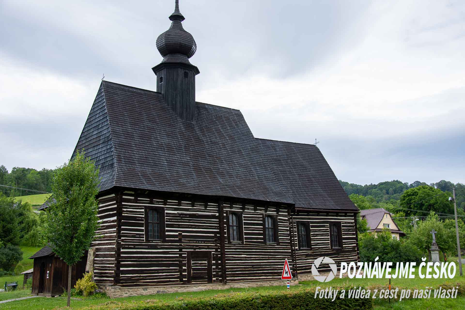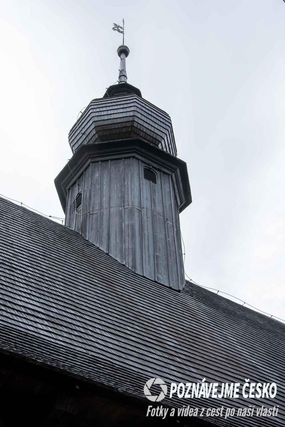 Zvenčí působí stavba velmi prostě. Podélný půdorys, vysoká valbová střecha krytá šindelem a drobná věžička s cibulovým zakončením dávají tušit spíš skromnost než monumentalitu. Právě tato zdrženlivost je jedním z důvodů, proč kostel tak přirozeně zapadá do okolního prostředí. Dřevo, kámen a šindel tu nejsou dekorací, ale přirozeným jazykem stavby.