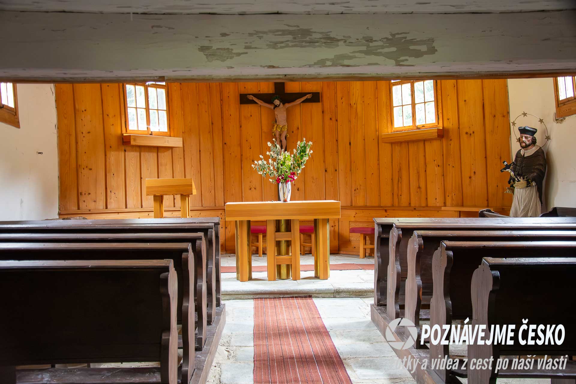 Vnitřní výzdoba je velmi prostá – tvoří ji především velký dřevěný kříž s Kristem a dřevěná plastika sv. Jana Nepomuckého. Před vstupem stojí kamenný kříž z 19. století, připomínající počátky této horské svatyně.